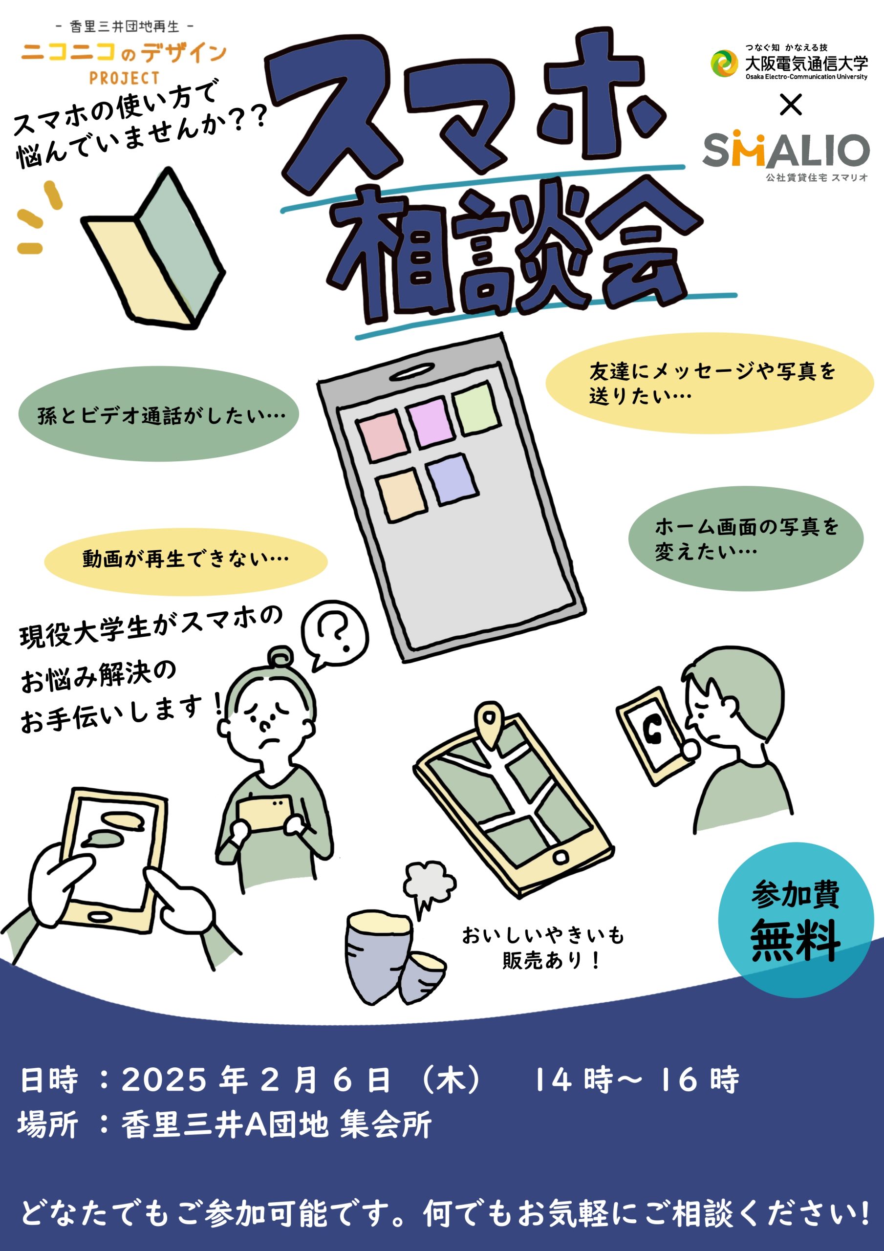2/6(木)14:00~16:00 香里三井団地集会所にて「スマホ相談会」を開催いたします。