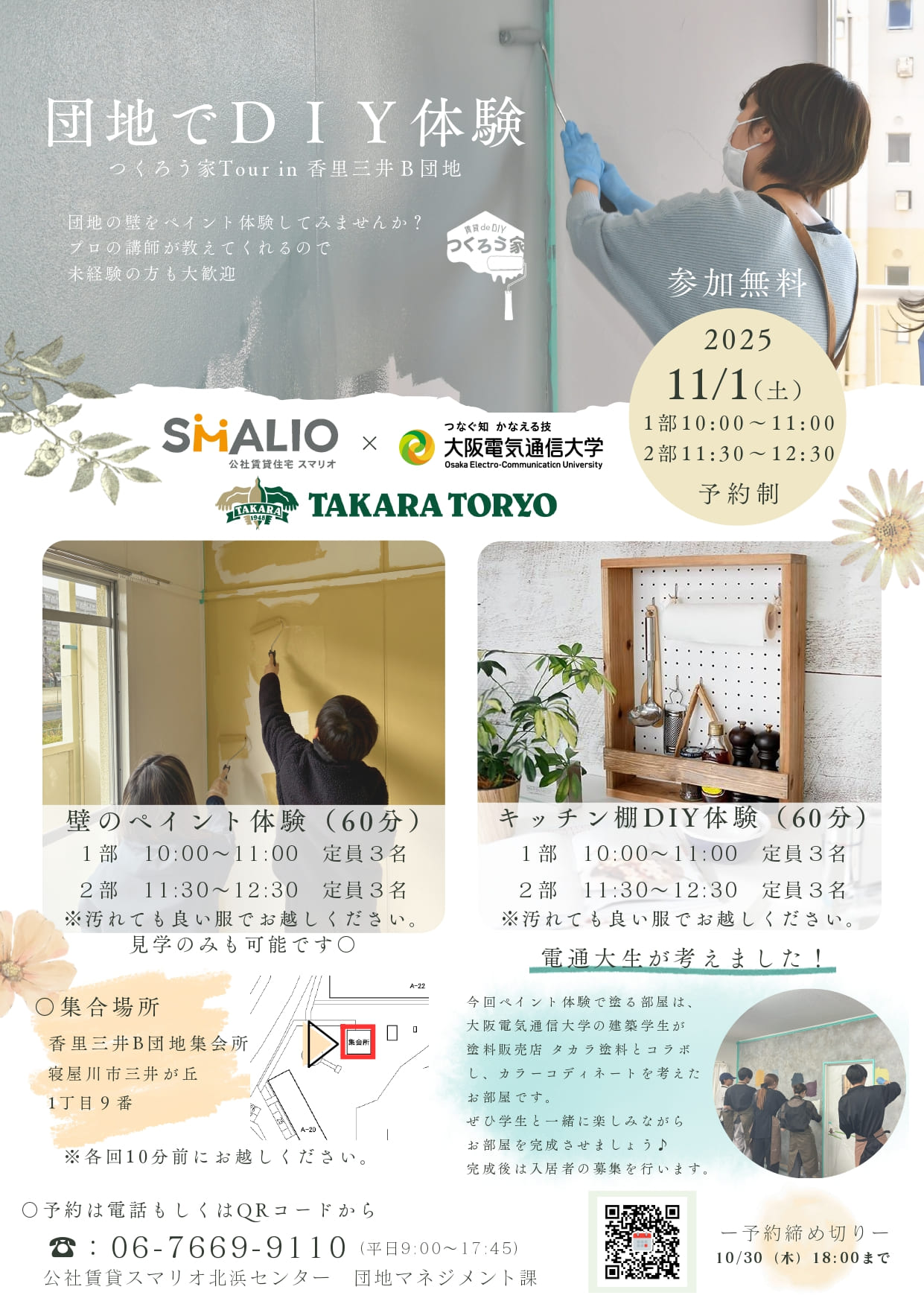 11/1(土)香里三井B団地にて壁のペイント体験・キッチン棚DIY体験を実施します。