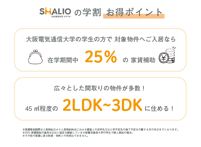 25%の家賃補助が適用されるのは、お申し込み時点で大阪電気通信大学に在学、または入学が決定している方です。