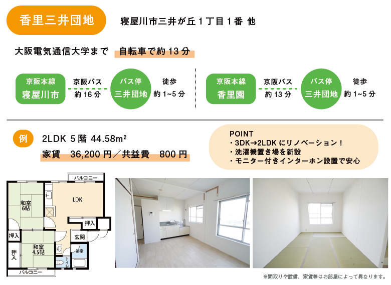 学割の対象は、大阪電気通信大学から自転車で約13分の所にある、香里三井・B・C団地の4・5階のお部屋です。(一部住戸を除く)