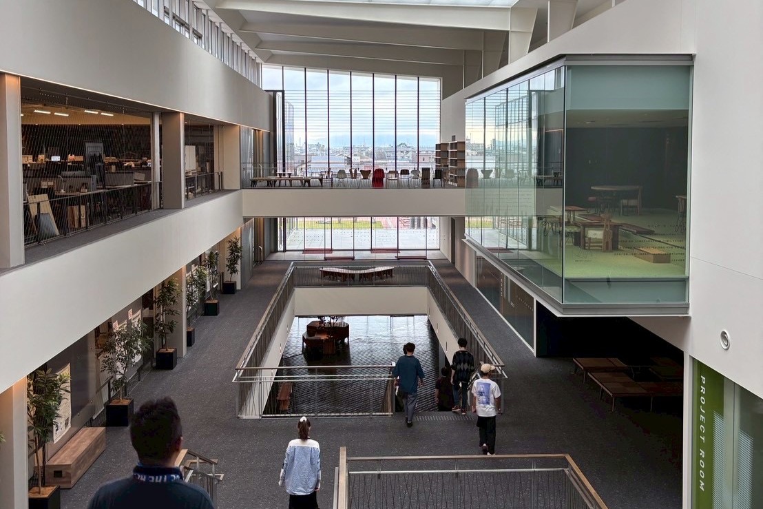 校舎の中は凹凸が特徴的な吹き抜けの建物で、建築を学ぶための設備が整っていました。